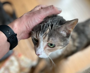 Enrichment. This is where listening to you and knowing your cat's personality is so important. Depending on the cat, enrichment may be play, being brushed, providing my lap for them to sit on, being petted or, if they just need some calm companionship I'll happily just sit quietly with them.